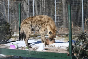 We rescued Rambo early March of 2021 and at the time of his rescue, he was 10 years old. There was a family who had him in south Arkansas as a pet. When the father of the family suddenly had a tragic death, the wife couldn’t care for Rambo by herself. That’s when she called TCWR to rescue him. Being a Spotted Hyena, he is going to need heat since he is an African animal. After his arrival here at TCWR, we didn’t have an open heated den around the tour road or in the upper part of the refuge so we put him in an open habitat down at Rescue Ridge. These habitats all have heated dens that way any animal can go down there and live comfortably.